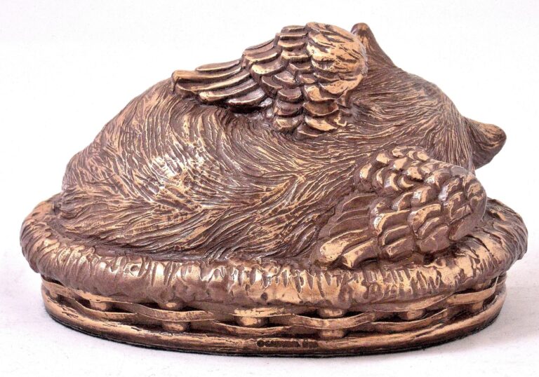 This Angelic Cat Urn is depicting a Kitty cozily sleeping in its warm basket bed. The Urn is made of “cold cast bronze” (polymer resin w/bronze filler) and hand-applied bronze patina. It comes with a felted bottom to protect furniture and is bottom-loaded with a 2″ snap-in security plug.