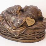 This Bronze Dog Urn is made of cold cast bronze (resin w/bronze filler) and hand applied bronze patina. The urn is bottom loaded with a felted bottom and a two inch snap-in security plug.