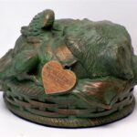 This Bronze Dog Urn made of cold cast bronze (resin w/bronze filler) and hand applied green patina. The urn is bottom loaded with a felted bottom and a two inch snap-in security plug.