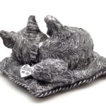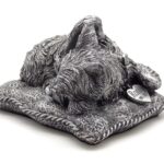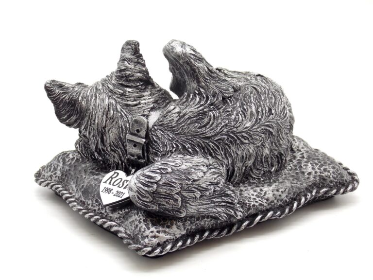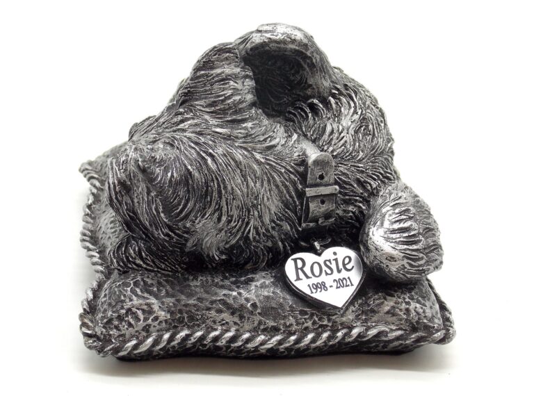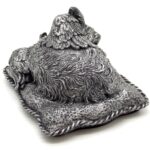 This highly detailed Angelic Yorkie Dog Memorial Urn is depicting a Yorkie cozily slipping on its pillow bed. The Yorkie urns are cast of polymer resin/bronze powder mixture and hand finished with bronze patina. The urn is bottom-loaded and secured with a threaded plug. Optional personalization with a heart-shaped name tag is available.