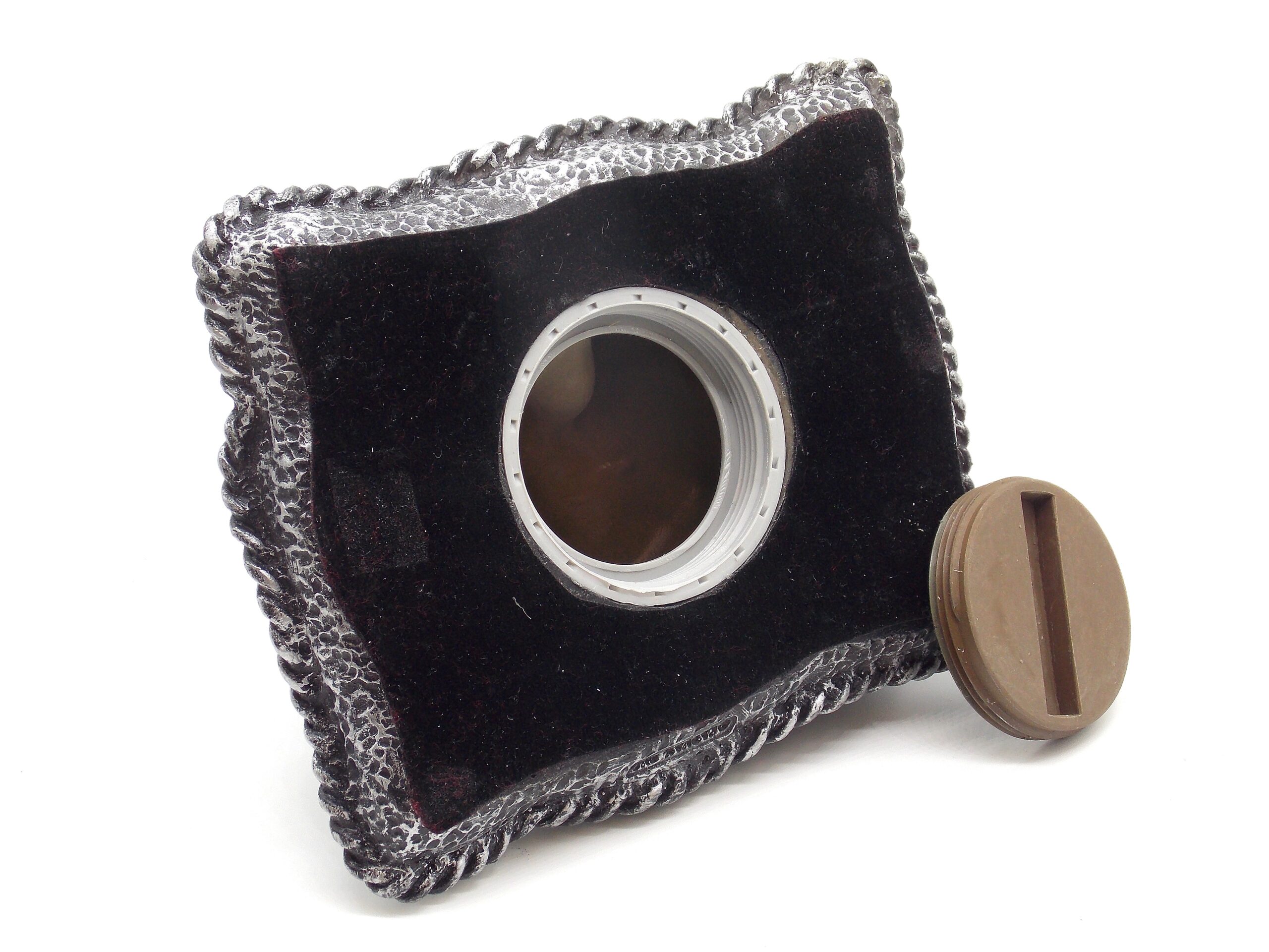 The urn gets secured from the bottom with a 2 1/4″ threaded plug. Dimensions: 7 (L) x 6 (W) x 4 1/2 (H) inches. Weight: 1.5 pounds.