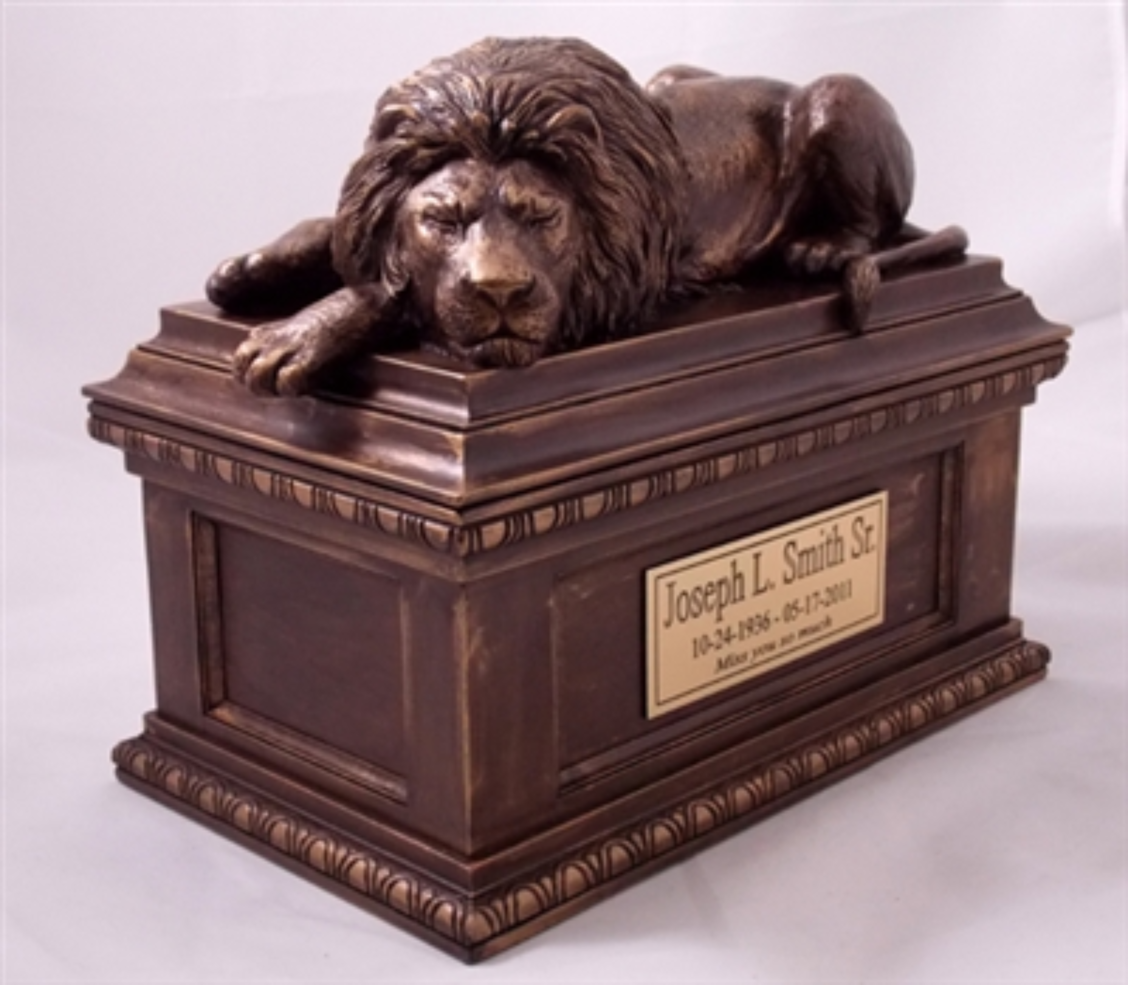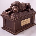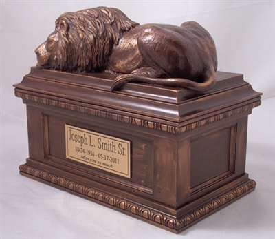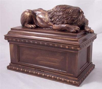 This symbolic Lion Memorial Urn is created by award winning American Artist. This large capacity urn is depicting a three-dimensional sculpture of a lion guarding the final resting place. The urn is made by the “cold cast bronze” technique (polymer/bronze powder mixture) and hand finished with bronze patina.