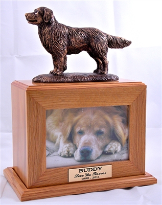 This Golden Retriever Oak Picture Memorial Urn is featuring an artfully sculpted figurine of a Golden Retriever Dog set on a genuine Oak wood urn. The figurine is created by the “cold cast bronze”(polymer with bronze additive) method and hand finished with bronze patina. This golden retriever urn is bottom loaded and secured with screws.