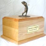 The Golfer Cremation Urn is made of Oak and enhanced with a very detailed, sculpted figurine of a golfer in order to make a memorial tribute for some one who enjoyed spending time on a golf course. The Golfer’s figurine is cast of resin with bronze additive and hand finished with bronze patina. His golden club is individually cast of brass at a jewelry shop.