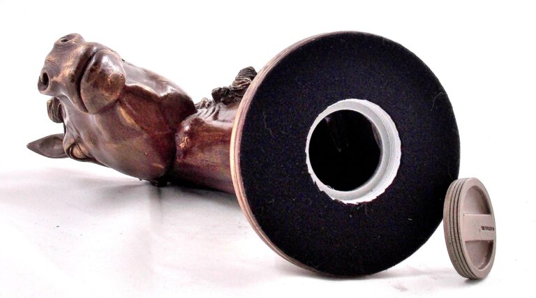 This artfully created with great details Horse Keepsake Urn is cast in cold cast Bronze (resin w/bronze filler) and hand-finished with bronze patina. It is designated to hold a small amount of cremains or a lock of hair. It comes with a felted bottom to protect furniture and is bottom-loaded with a 2-inch threaded security plug. Made in the USA.
