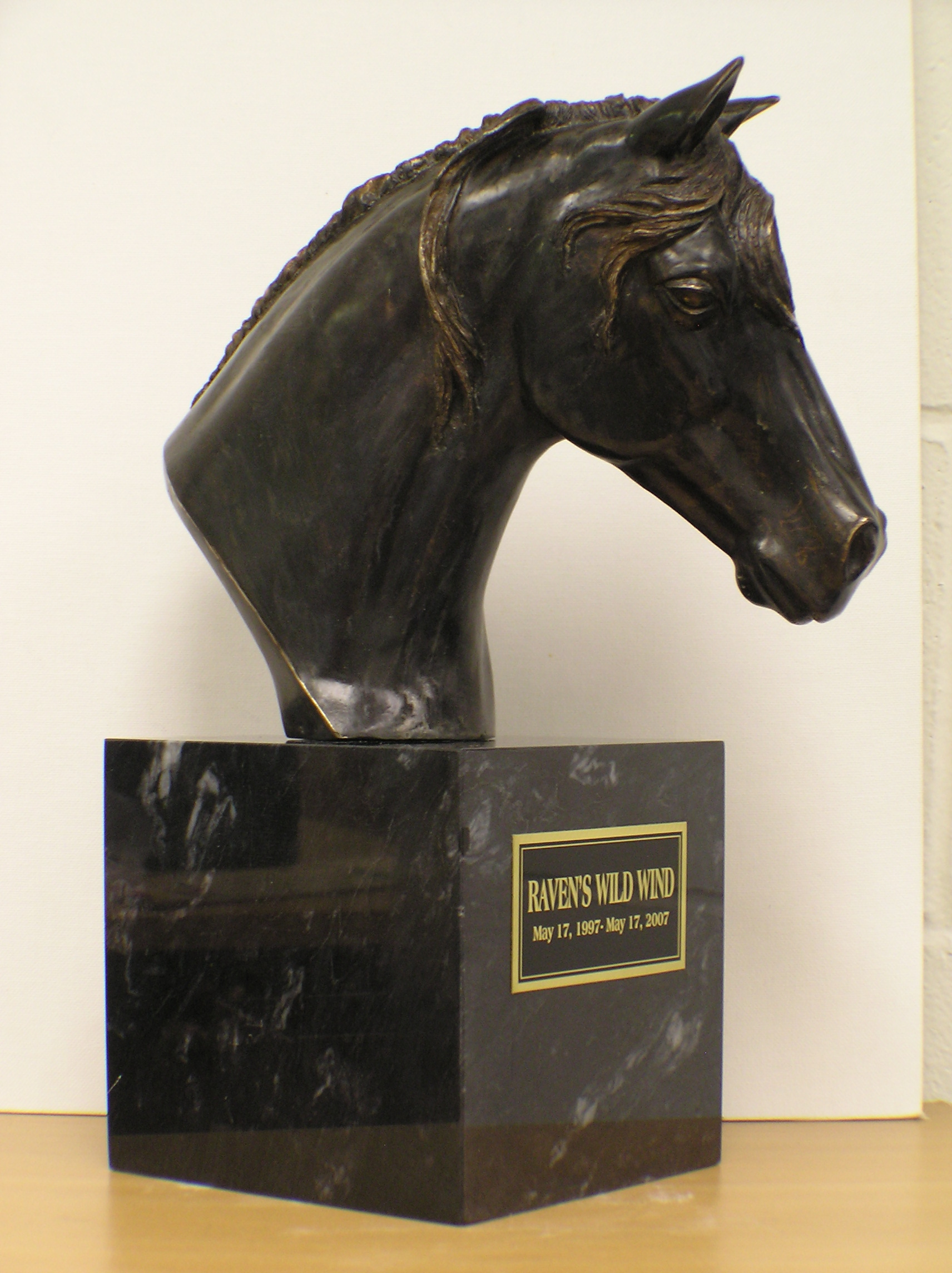 This is a custom-created sculptural portrait of a Horse by customer-provided photographs. The sculpture was cast of bronze and set on a beautiful custom-cut black marble urn container.