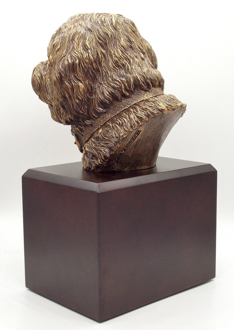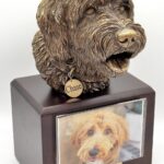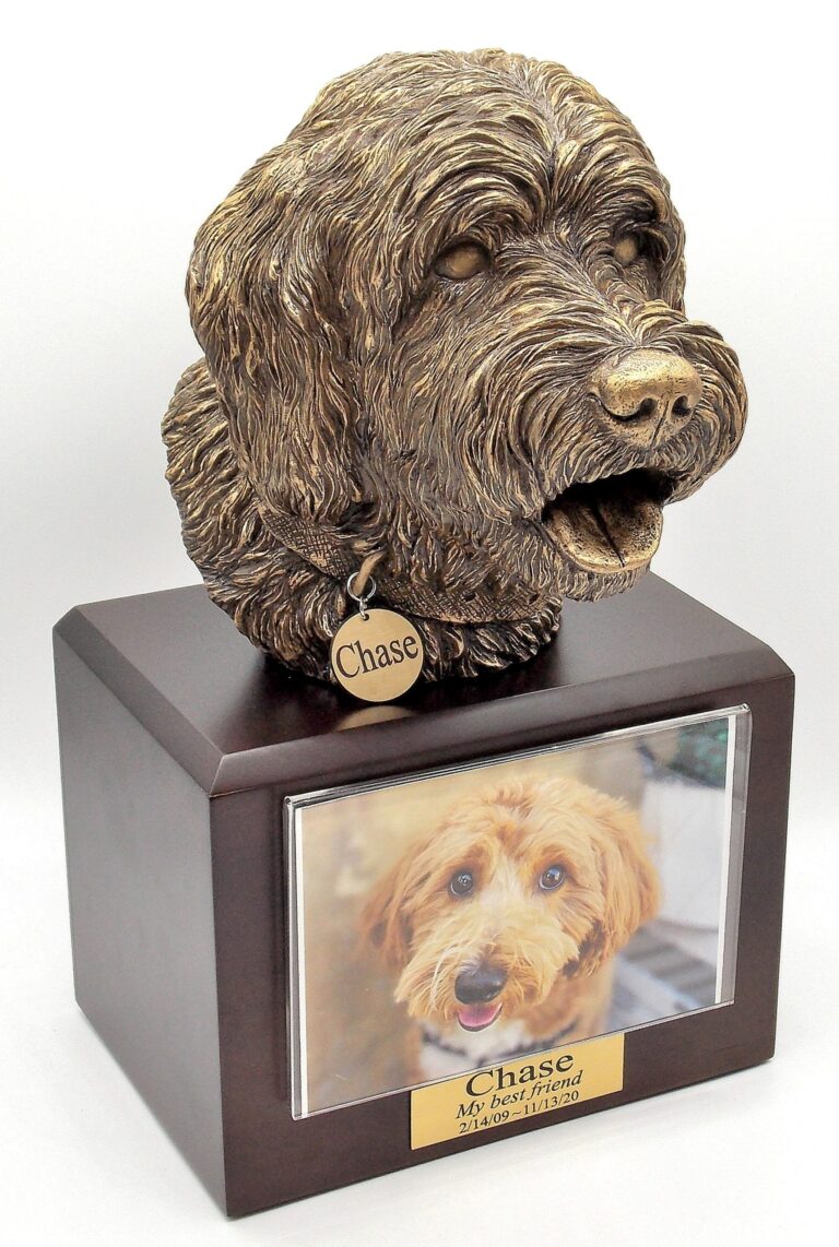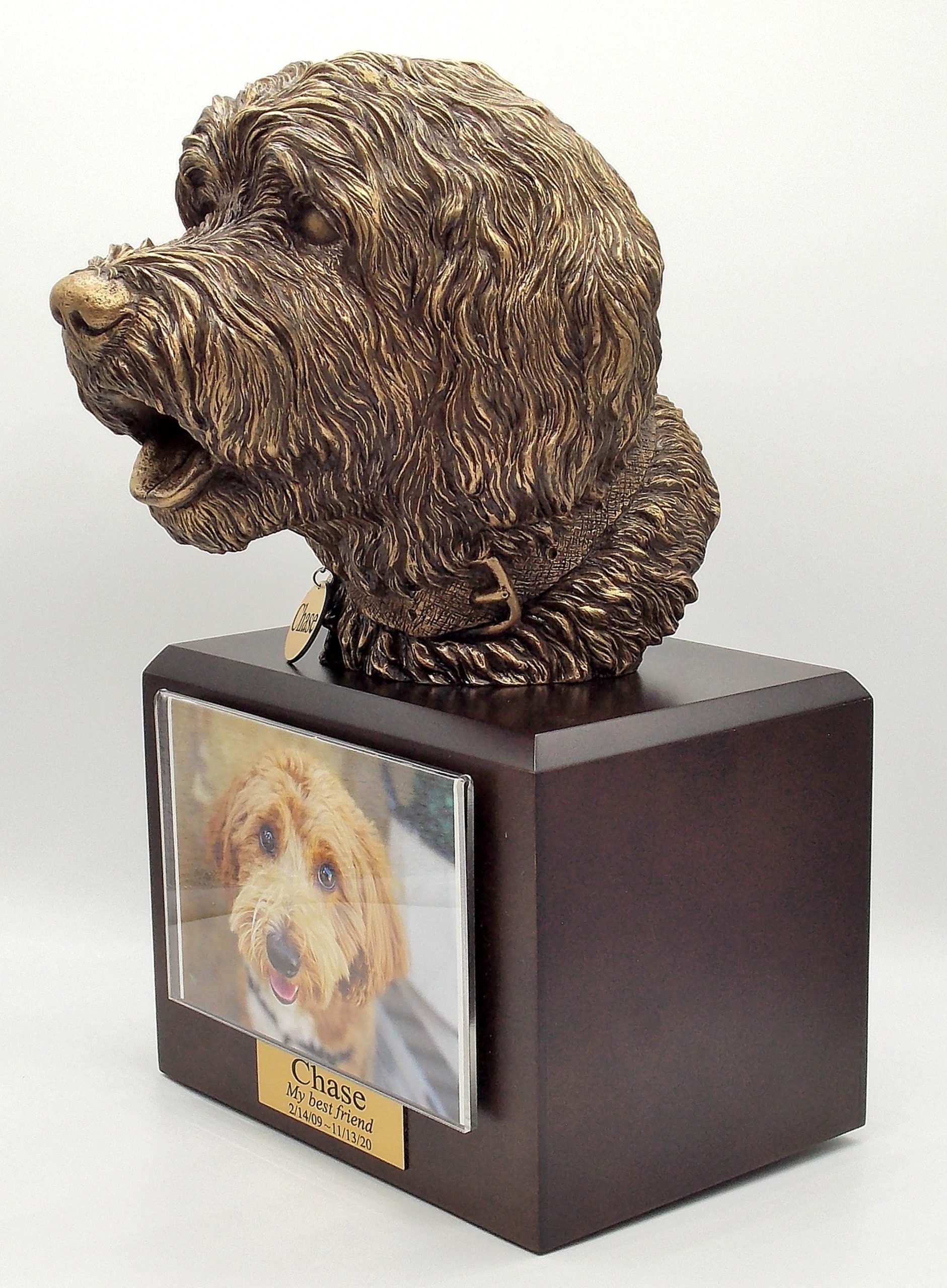 This is our Golden/Labradoodle Dog Memorial Urn. Witty, joyful, mischievous, and always ready to play – are some qualities of these great family-oriented dogs that we tried to implement when creating the sculpture. Since these breeds are very similar, this Memorial Urn will work for Goldendoodle, Labradoodle, or any other “doodle” related breed. We paid close attention to tiny details while working on this sculpture. The “Doodle” bust is created by the “cold-cast bronze” (polymer resin/bronze powder mixture) technique and is hand-finished with a bronze patina. This Memorial Urn comes with a Walnut-finished wood urn. Alternatively, customers may request the Oak wood urn option. The urn box has a removable bottom that is secured with screws.