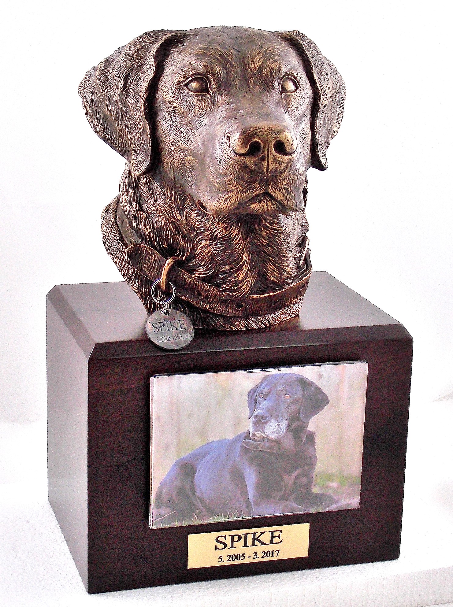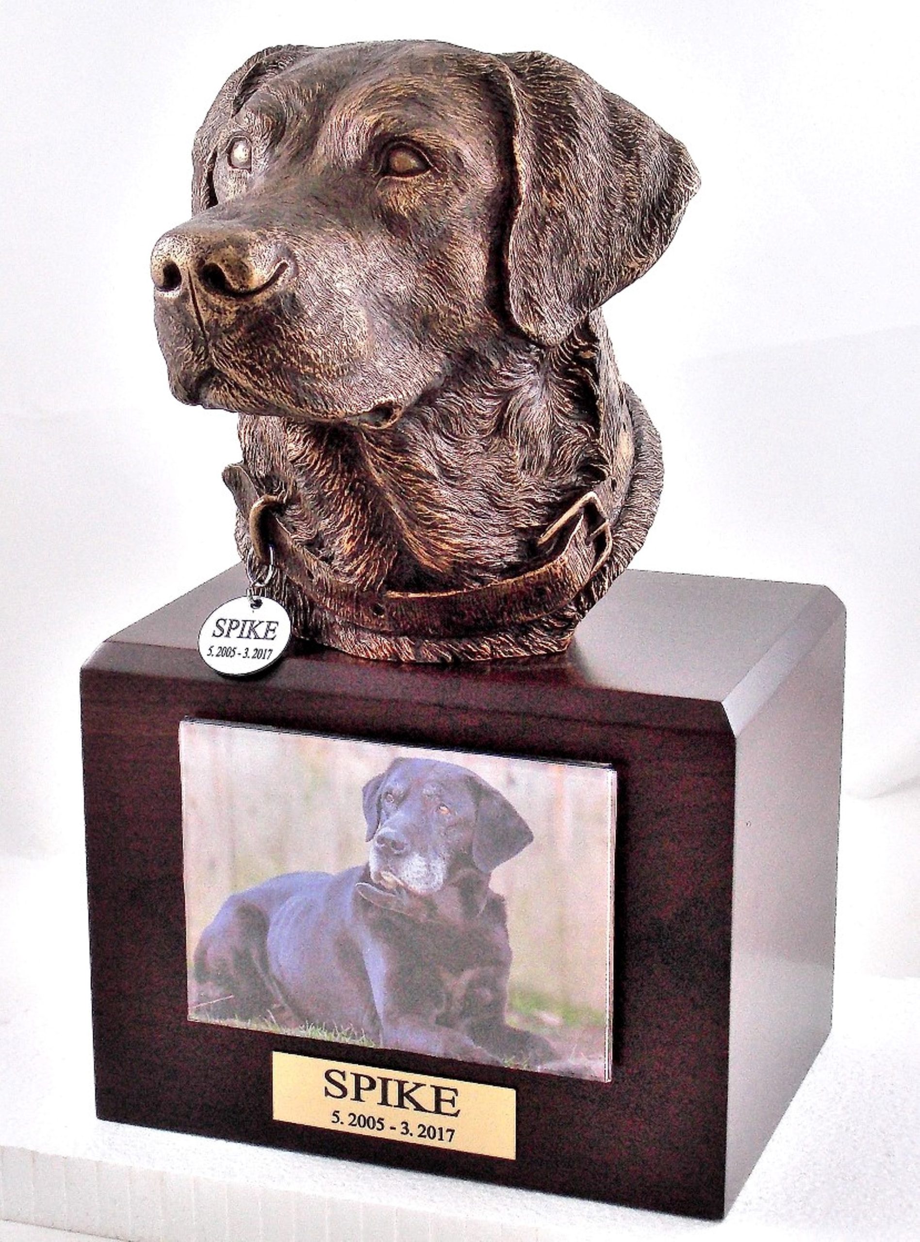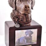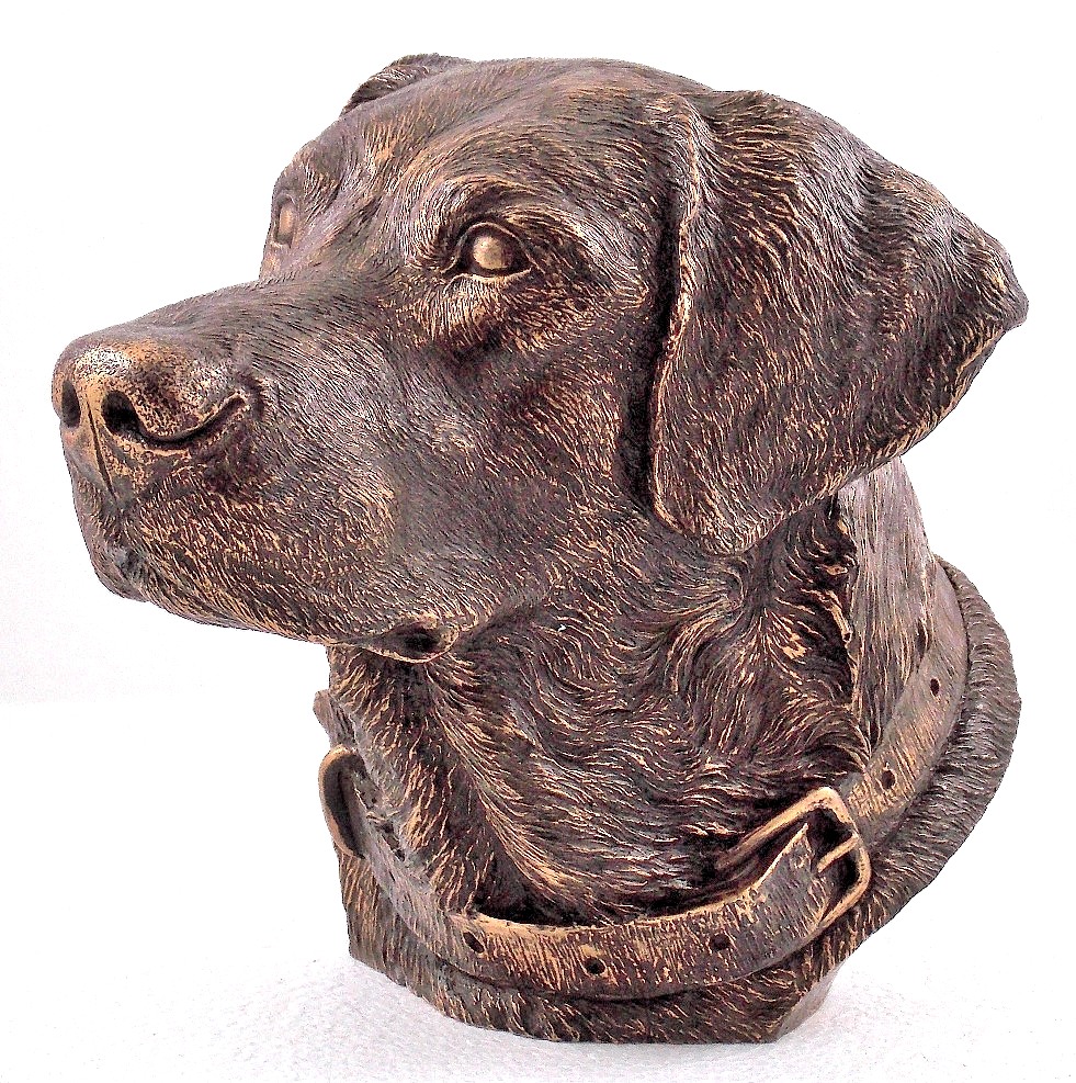 This highly detailed portrait of a Labrador Retriever Dog was created by an award-winning American artist and will make a wonderful tribute to your beloved friend. It is cast by the “cold-cast” (polymer resin/black pigment mixture) technique and hand-finished with bronze patina. The Lab bust sculpture comes with a Walnut finished hardwood urn box. The unique feature of this piece, that it is giving the customers a chance of using their existing Name Tag by attaching it to the Lab’s collar. A two jump-ring attachment is provided.