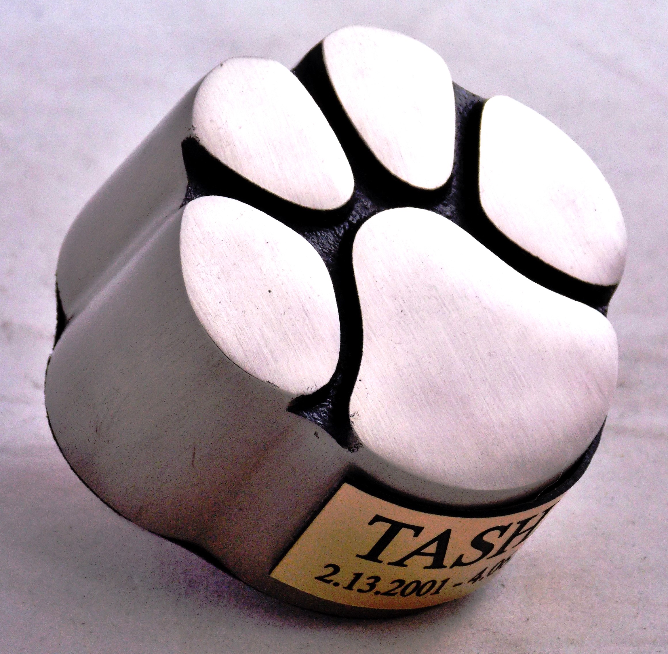 This Paw Print Keepsake is designed to securely hold a small number of ashes or a piece of hair of your beloved pet. The Keepsake is cast of solid brass and has a Stainless steel finish. The bottom opening is secured with a threaded plug. Optional personalization is available.