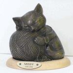 This Artistic quality Kitty Urn is cast of solid aluminum and hand finished with bronze patina. The urn is bottom loaded with and comes with a custom designed maple display base.