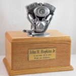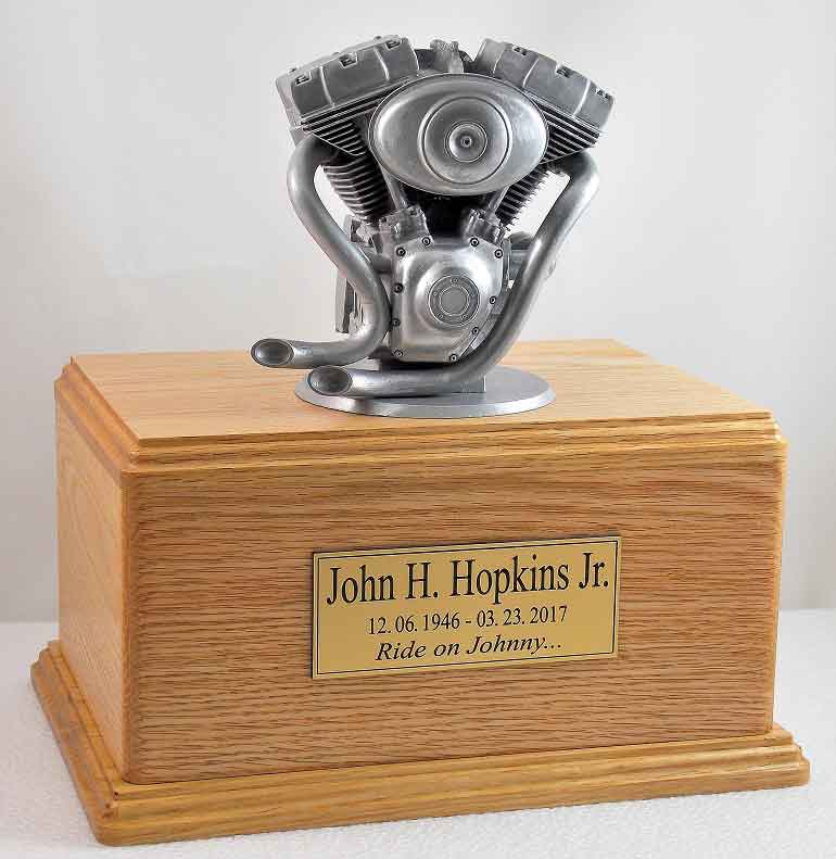 This Motorcycle Engine Urn is a perfect memorial for the motorcycle enthusiast. The cremation urn is made of solid American oak and features a highly detailed motorcycle engine sculpture. The engine is cast of resin with silver pigment additive and hand finished with silver patina. The removable bottom panel secures with included screws. Made in the USA.